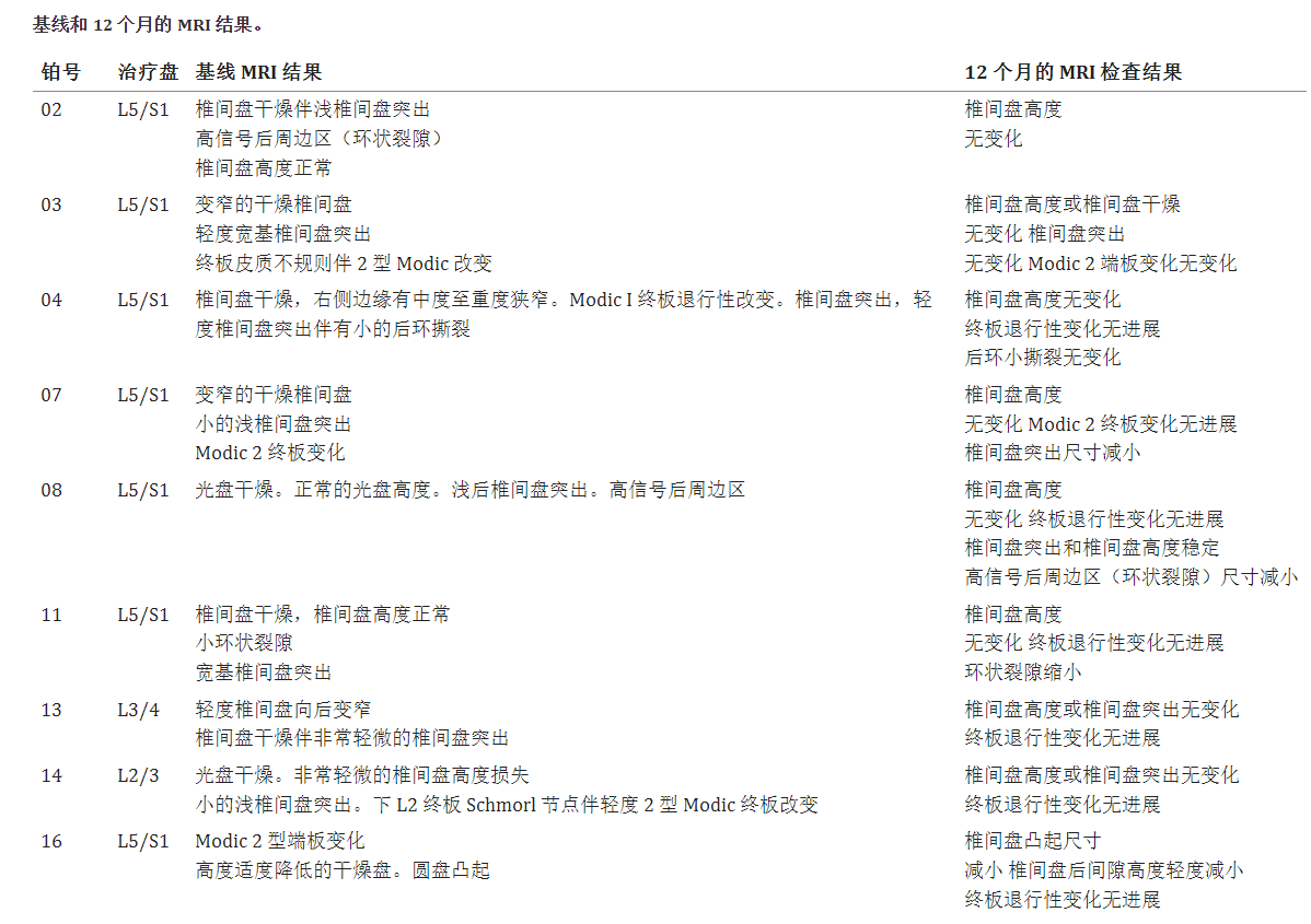 簡要結果:沒有記錄到意外或嚴重的不良事件。七名 (78%) 參與者報告在治療后12個月疼痛有所減輕。五位 (56%) 報告工作能力有所提高。三名 (33%) 減少了鎮痛藥的使用。觀察到EQ-5D和Oswestry殘疾指數結果的改善。MRI顯示沒有進一步的椎間盤退變和環狀裂隙和椎間盤突出的改善。