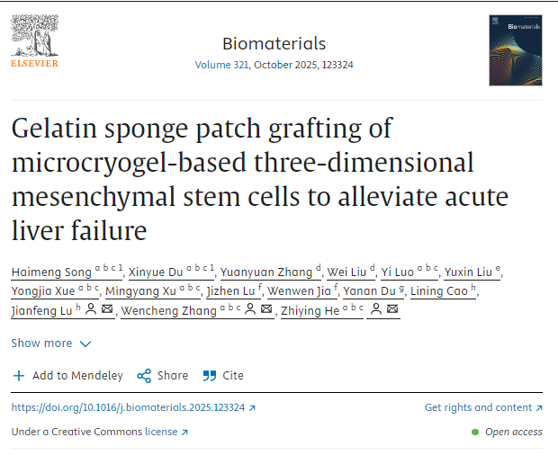 [10]Song H, Du X, Zhang Y, Liu W, Luo Y, Liu Y, Xue Y, Xu M, Lu J, Jia W, Du Y, Cao L, Lu J, Zhang W, He Z. Gelatin sponge patch grafting of microcryogel-based three-dimensional mesenchymal stem cells to alleviate acute liver failure. Biomaterials. 2025 Oct;321:123324. doi: 10.1016/j.biomaterials.2025.123324. Epub 2025 Apr 9. PMID: 40253733.