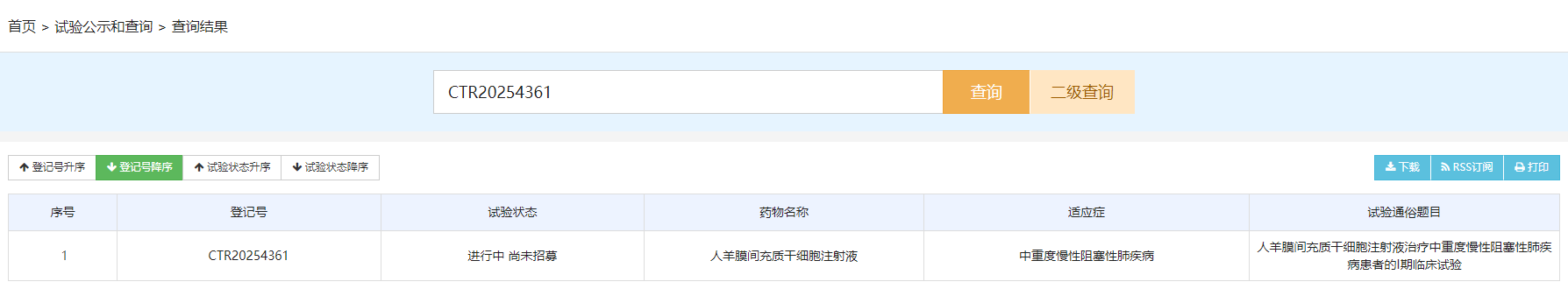 11月5日,藥物臨床試驗(yàn)登記與信息公示平臺(tái)數(shù)據(jù)顯示,源品細(xì)胞生物科技集團(tuán)有限公司的一項(xiàng)評(píng)價(jià)人羊膜間充質(zhì)干細(xì)胞注射液治療中重度慢性阻塞性肺疾病患者的安全性、耐受性及有效性的I期臨床試驗(yàn)已啟動(dòng)。臨床試驗(yàn)登記號(hào)為CTR20254361,首次公示信息日期為2025年11月5日。[12]