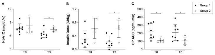 (A) 在ASC輸注前 (T0) 和三個月后 (T3) 測量的HbA1C水平。第1組的HbA1C水平顯著低于第2組 (p=0.03)。(B) 在 ASC 輸注前 (T0) 和三個月后 (T3) 所需的胰島素劑量。第1組所需的胰島素劑量顯著低于第2組 (p=0.01)。(C) 在 ASC 輸注前 (T0) 和三個月后 (T3) 測量的C肽AUC。第1組和第2組的C肽AUC沒有顯著差異 (p=0.06)。圖中的星號表示兩組之間存在統(tǒng)計學(xué)上的顯著差異。