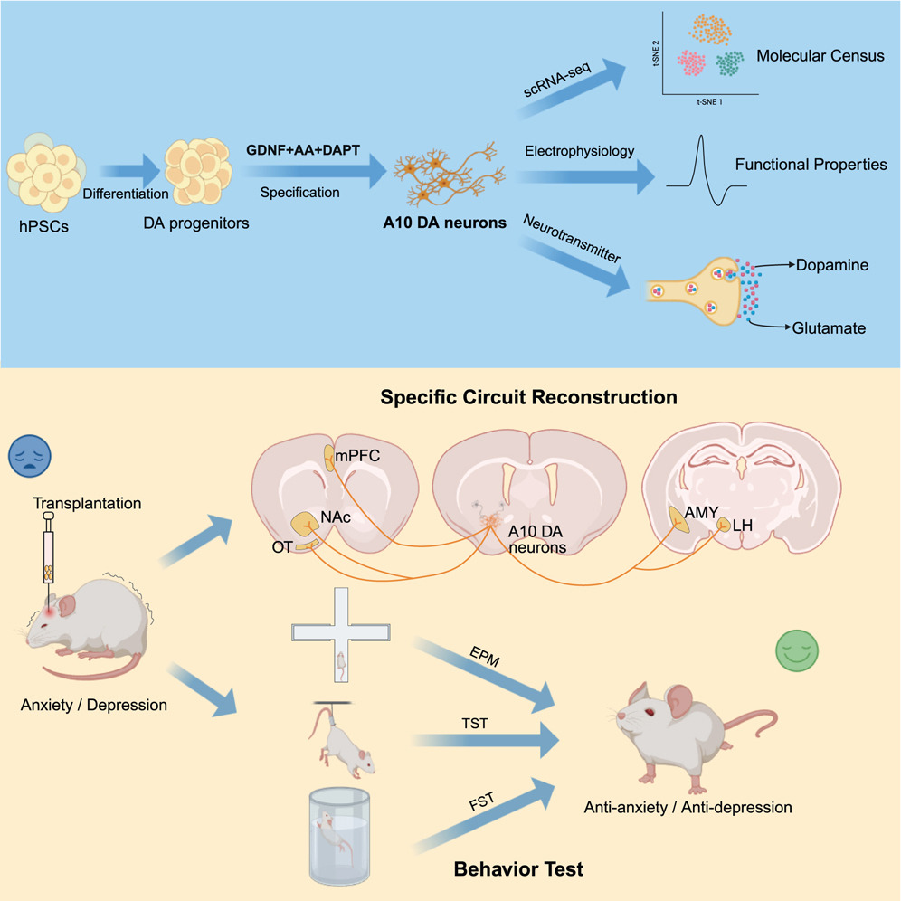本研究首次證明,移植hPSC衍生的特定神經元亞型(A10) 可以精準重建該神經環路,并有效改善模型小鼠的行為異常。