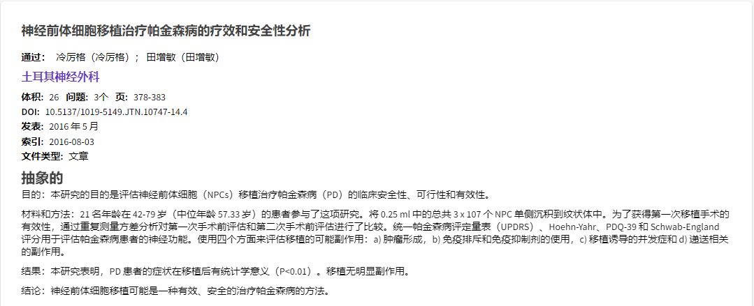 最近,土耳其報道了一項神經干細胞移植治療帕金森病的I期研究。21名PD患者在特定時間間隔將ESCs來源的神經干細胞移植到雙側紋狀體中,患者的運動功能明顯改善,且無明顯副作用。