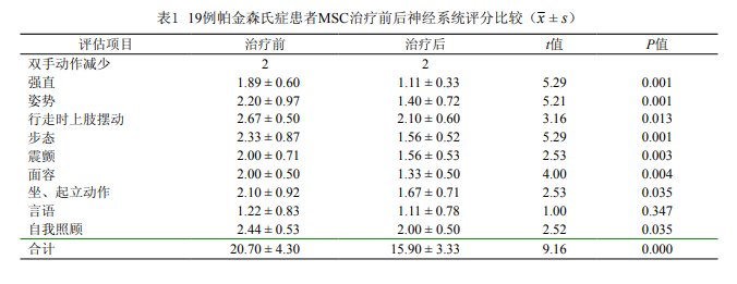 蘭州軍區蘭州總醫院干細胞治療中心[6]收治19例PD患者,給予鞘內注射臍帶間充質干細胞治療,治療后患者無明顯不良反應,治療安全性良好,觀察治療后3個月多數患者癥狀改善, 尤其是肌張力增高引起癥狀改善明顯,如強直、姿勢、步態、震顫、面容方面,結果如下: