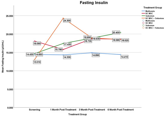 圖5:二甲雙胍組、UC-MSC組、分泌組和UC-MSC+分泌組的平均血清空腹胰島素水平隨時間的變化。
