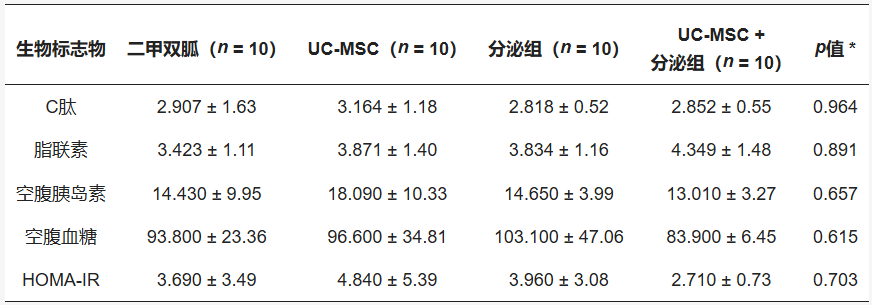 • 其他所有治療組(二甲雙胍、UC-MSC、聯(lián)合治療)均未觀察到HOMA-IR的顯著變化。