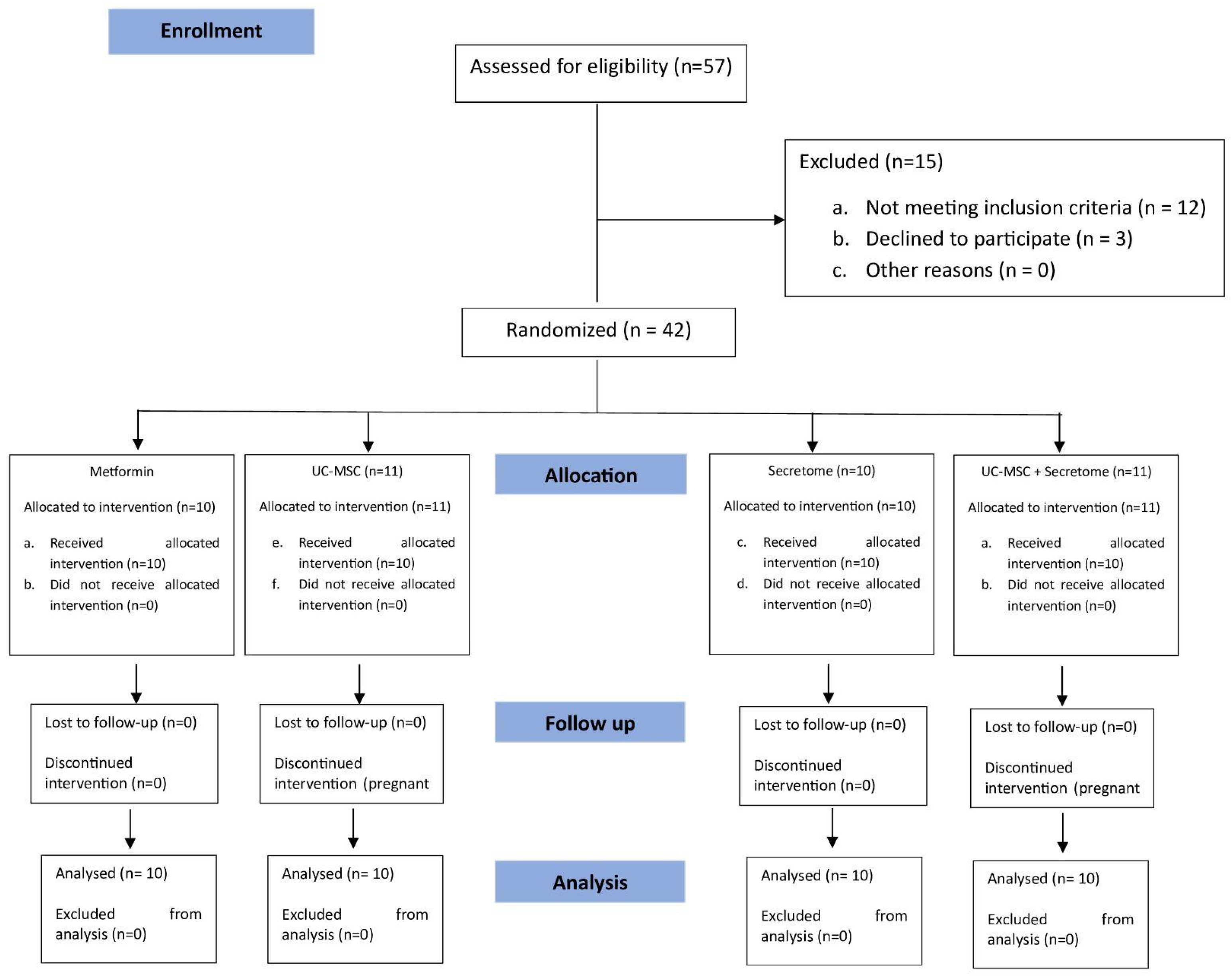 這項研究是一項隨機對照試驗,將40名符合鹿特丹診斷標準的PCOS女性平均分為四組:二甲雙胍組、臍帶間充質(zhì)干細胞(UC-MSC)組、分泌組以及UC-MSC聯(lián)合分泌組。所有受試者均完成了為期6個月的隨訪,依從性良好。