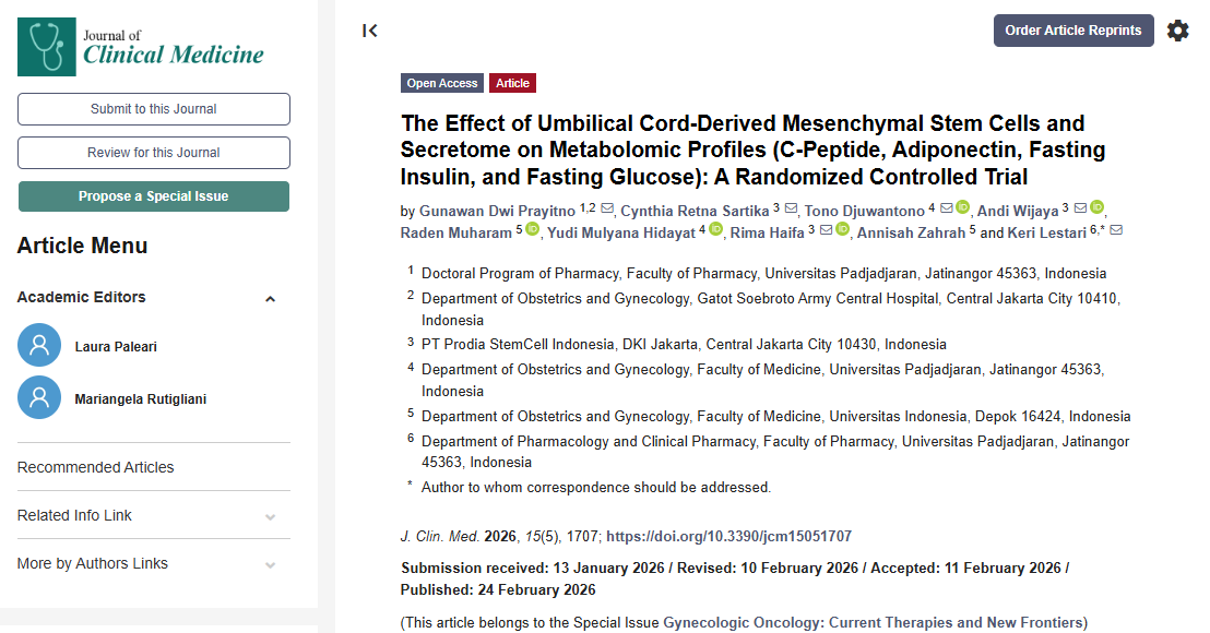 [1]:Prayitno, G.D.; Sartika, C.R.; Djuwantono, T.; Wijaya, A.; Muharam, R.; Hidayat, Y.M.; Haifa, R.; Zahrah, A.; Lestari, K. The Effect of Umbilical Cord-Derived Mesenchymal Stem Cells and Secretome on Metabolomic Profiles (C-Peptide, Adiponectin, Fasting Insulin, and Fasting Glucose): A Randomized Controlled Trial. J. Clin. Med. 202615, 1707. https://doi.org/10.3390/jcm15051707