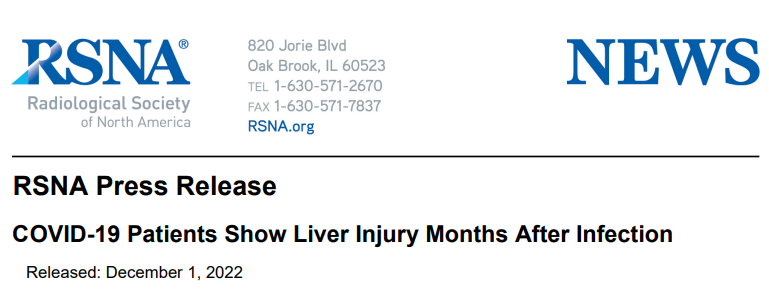 2022年12月1日,美國波士頓大學醫學院的研究人員在北美放射學會(RSNA)年會上發表的一項題為“COVID-19 Patients Show Liver Injury Months After Infection”的新研究。該研究表明,感染新冠,與肝臟硬度增加有關,可能導致長期的肝損傷。