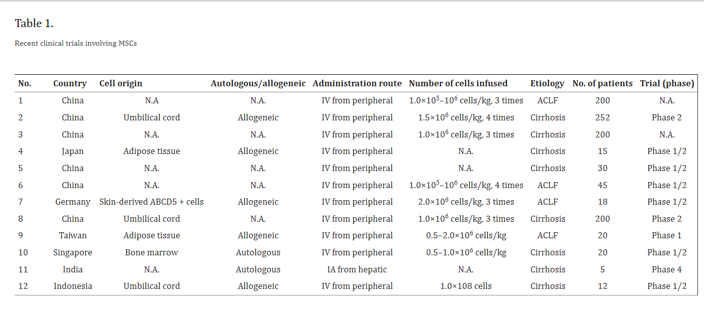 此外,為了描述以MSC為導(dǎo)向的臨床試驗的最新趨勢,我們根據(jù)ClinicalTrials.gov(表格1). 其中大部分在亞洲國家注冊。研究在細(xì)胞來源、自體與同種異體性質(zhì)以及肝硬化的病因?qū)W方面各不相同。然而,在大多數(shù)研究(12項中的11項)中,MSC給藥是通過外周注射每劑約1×106MSC/kg。研究不僅關(guān)注肝硬化,還關(guān)注急性慢性肝衰竭 (ACLF)。由于MSCs在炎癥期間表現(xiàn)出更強(qiáng)的治療效果,因此它們在ACLF的情況下可能特別有效。總而言之,許多面向MSC的臨床試驗尚未超過I期或II期。