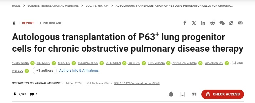 2024年2月14日,同濟大學醫(yī)學院附屬東方醫(yī)院左為教授團隊,與廣州醫(yī)科大學附屬第一醫(yī)院鐘南山院士、李時悅教授團隊,以及陸軍軍醫(yī)大學附屬西南醫(yī)院戴曉天教授合作,在全球頂級轉化醫(yī)學刊物《科學-轉化醫(yī)學》雜志發(fā)表了題為“移植自體P63陽性肺前體細胞用于慢性阻塞性肺病的治療”的研究論文。[9]