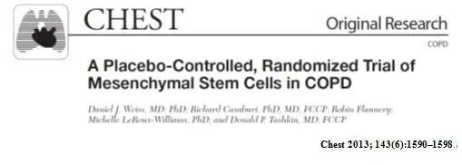 2013年,《Chest》雜志上發(fā)表了間充質(zhì)干細(xì)胞治療中、重度慢阻肺的安全性和有效性的臨床研究報(bào)告。在此項(xiàng)研究中共收治了62名慢阻肺患者,并隨機(jī)分為試驗(yàn)組和對(duì)照組,試驗(yàn)組患者通過(guò)靜脈輸注的方式進(jìn)行間充質(zhì)干細(xì)胞治療,每月1次,共4次。