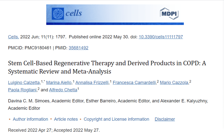 2022年5月,意大利帕爾馬大學(xué)的研究團(tuán)隊(duì)在《Cells》雜志上發(fā)表了基于干細(xì)胞的再生療法以及衍生產(chǎn)品對(duì)慢性阻塞性肺病(COPD)患者的療效情況,這項(xiàng)研究分析了11項(xiàng)臨床研究,共提取了371名COPD患者的數(shù)據(jù)。結(jié)果表明基于干細(xì)胞的再生療法和衍生產(chǎn)品對(duì)COPD患者有著一定的治療效果。