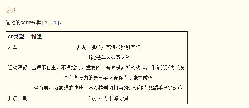 通常,CP是根據 Ingram和Hagbergs分類法進行分類的;然而,歐洲腦癱監測 (SCPE) 已將CP簡化為痙攣型、共濟失調型和運動障礙型(表3) 。