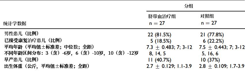 這項臨床研究入組了54名患兒,平均分為兩組。治療組的27人在大約一個月內接受了4次臍帶間充質干細胞輸注(單次細胞量為5×10^7,每次間隔7天),而對照組的27人輸注的是0.9%生理鹽水。兩組受試者均同時接受基礎康復治療。