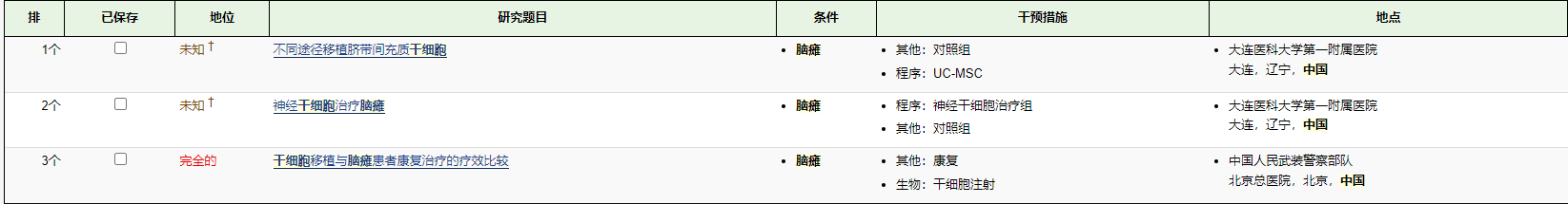 | 1個 | | 未知 ? | 骨髓干細胞移植治療腦癱 | 腦癱 | 生物:干細胞療法 | |