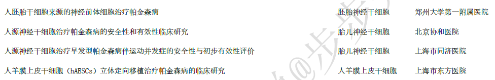 干細(xì)胞治療帕金森病目前也是一個(gè)不錯(cuò)的選擇。國(guó)內(nèi)也有機(jī)構(gòu)正在積極開(kāi)展治療帕金森的干細(xì)胞療法臨床研究。在兩委局,干細(xì)胞臨床研究備案項(xiàng)目目前有4個(gè),細(xì)胞來(lái)源有3種(分別hESC衍生的神經(jīng)前體細(xì)胞,胎兒神經(jīng)干細(xì)胞和羊膜上皮干細(xì)胞),如下表: