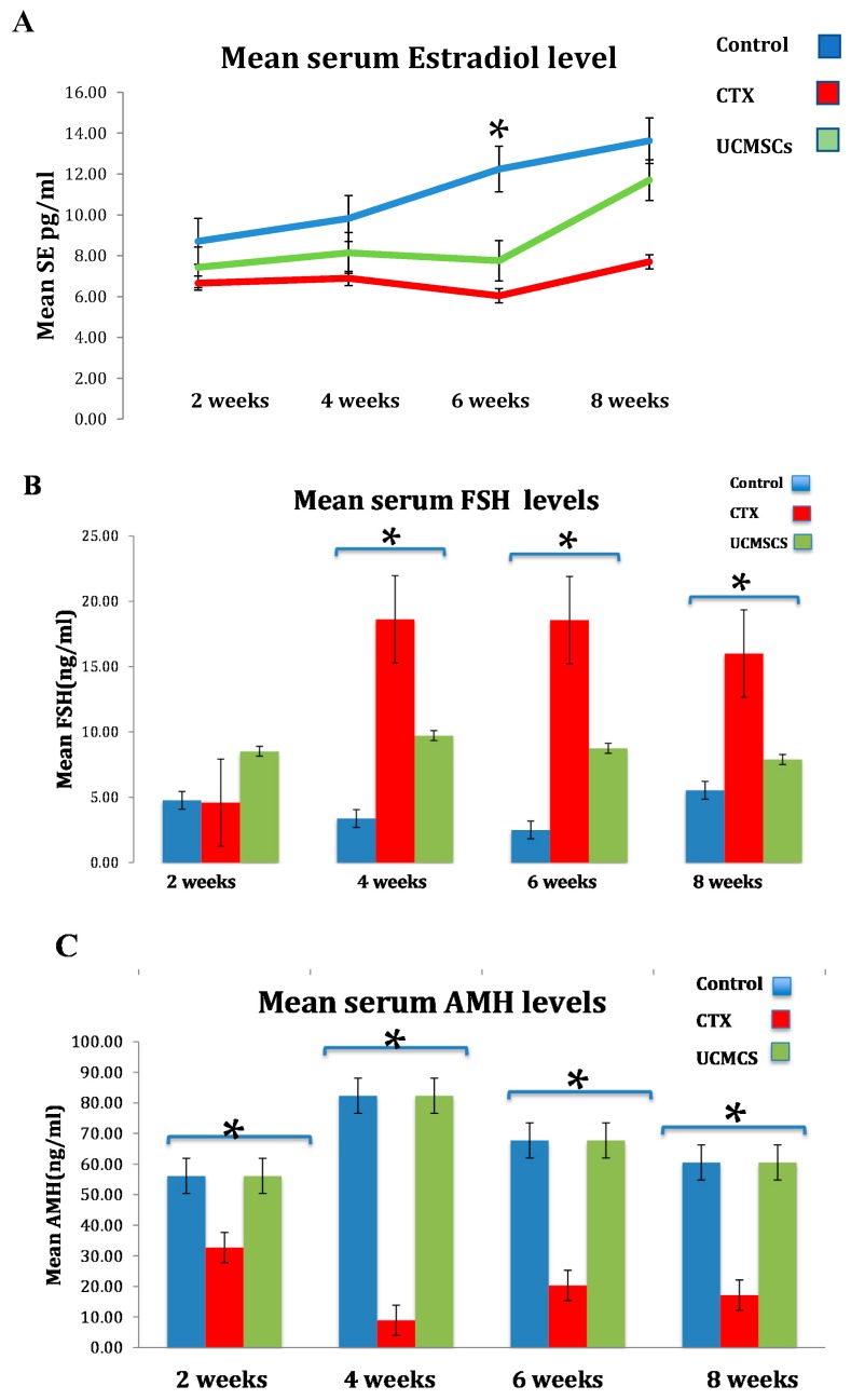 與第2組相比,第3組的激素特征顯示為血清FSH水平顯著降低40%±5 ( p<0.05),血清AMH水平顯著升高50%±2 ( p<0.05)。此外,與對(duì)照組相比,CTX 組的雌二醇顯著下降,然而,UCMSCs組對(duì)對(duì)照組的正常水平表現(xiàn)出不斷升級(jí)的態(tài)度(圖3)。