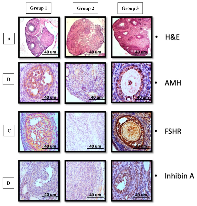 - ( B–D) 與第2組相比,第1組和第3組分別證實(shí)了AMH和促卵泡激素受體 (FSHR) 和抑制素A的表達(dá)增加。(比例尺40μm)