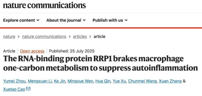 2025年7月25日,中國(guó)醫(yī)學(xué)科學(xué)院系統(tǒng)醫(yī)學(xué)研究院曹雪濤院士團(tuán)隊(duì)在《Nature Communications》上發(fā)表了題為:The RNA-binding protein RRP1 brakes macrophage one-carbon metabolism to suppress autoinflammation的研究論文。[10]