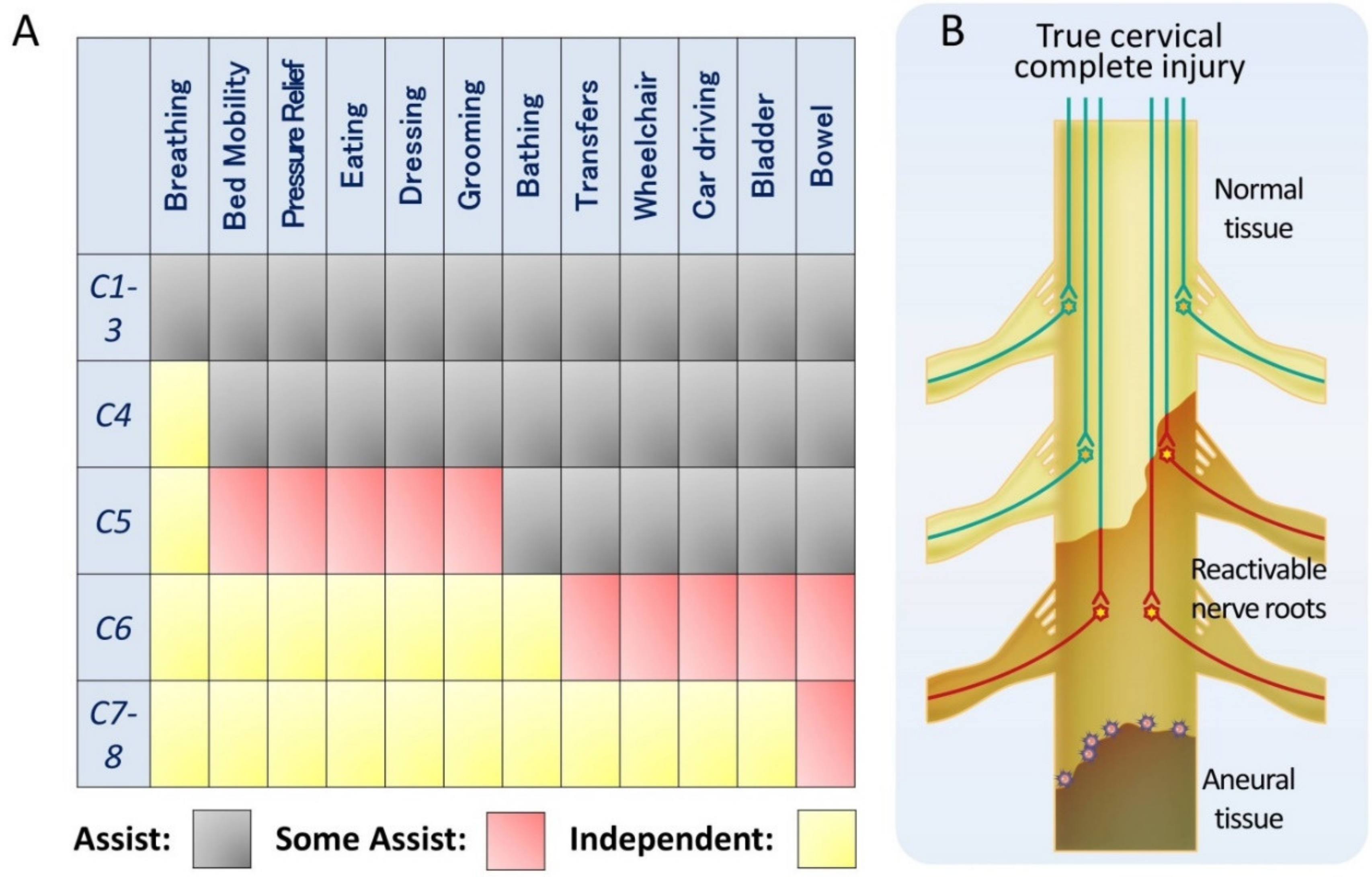 ( B ) 真正的完全性頸髓損傷。神經區穿過脊髓(灰色),但它周圍的可再激活組織(淺棕色)仍然存在。隨著可重新激活的組織因干細胞治療而變得有功能,患者的ADL有望增加。
