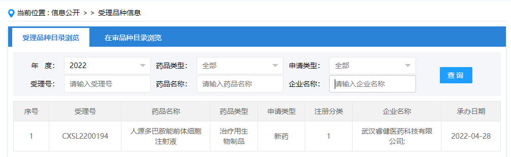 2022年4月28日,據(jù)國家藥監(jiān)局藥品審查中心(CDE)官網(wǎng)-受理品種信息公示,武漢睿健醫(yī)藥科技有限公司(簡稱“睿健醫(yī)藥”)“人源多巴胺能前體細胞注射液”(代號:NouvNeu001)臨床試驗申請(IND)已獲受理(受理號:CXSL2200194)。