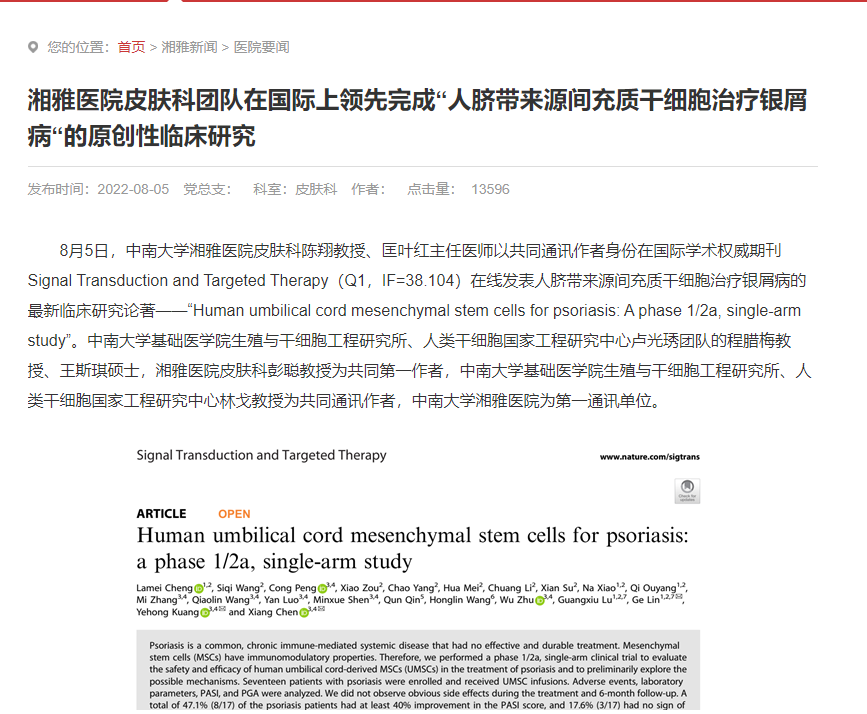 2022年8月5日,中南大學湘雅醫院在Nature子刊《signal transduction and targeted therapy》發表間充質干細胞治療銀屑病最新臨床研究結果。