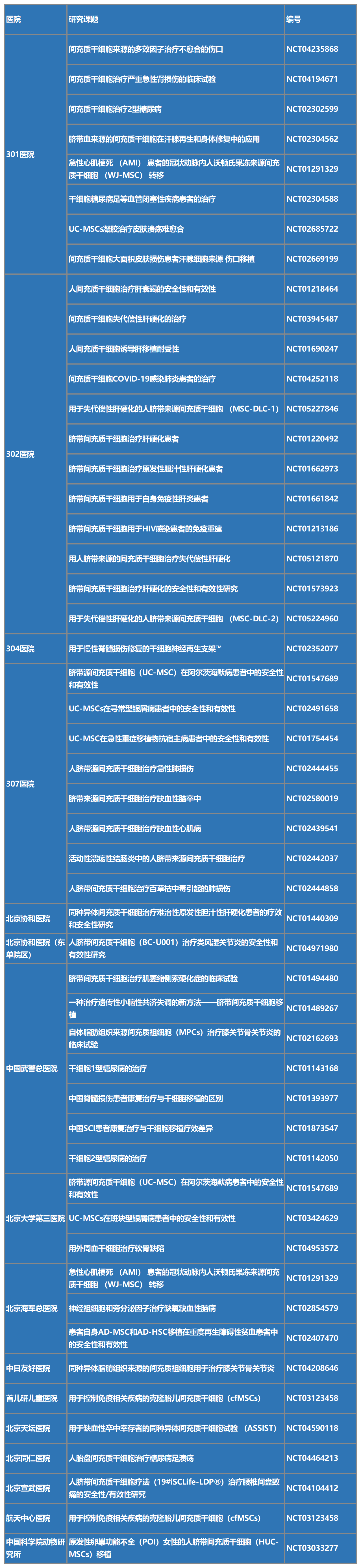 北京,作為我國的首都,一直是中國醫(yī)療科研的重要中心。近年來,北京的醫(yī)院在干細(xì)胞研究領(lǐng)域也取得了顯著的進(jìn)展。通過在全球臨床試驗(yàn)注冊平臺ClinicalTrials.gov上的檢索,我們發(fā)現(xiàn)北京的多家醫(yī)院,包括301醫(yī)院、302醫(yī)院、304醫(yī)院、307醫(yī)院、協(xié)和醫(yī)院、武警總醫(yī)院、兒童醫(yī)院、同仁醫(yī)院以及宣武醫(yī)院等,都在積極開展間充質(zhì)干細(xì)胞臨床試驗(yàn)。(截于2023年5月),包括不限于這些項(xiàng)目: