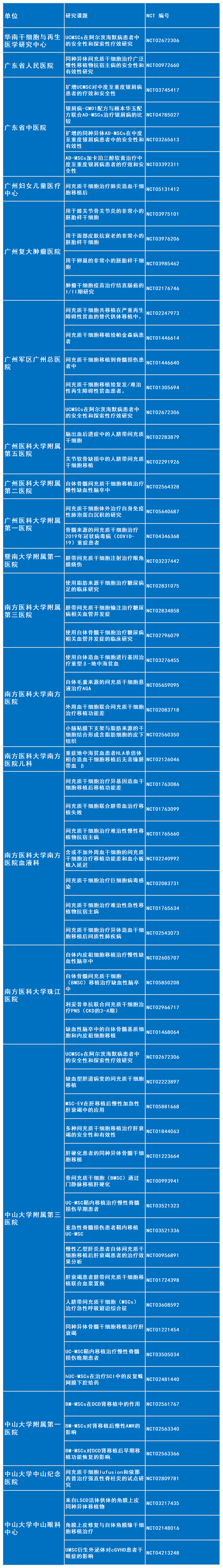 廣州,這座歷史悠久而又充滿活力的南方城市,以其開放的城市精神和先進的醫療水平,正在引領著中國的干細胞研究。在這里,一群優秀的醫療機構正在積極開展干細胞臨床試驗,他們在ClinicalTrials.gov注冊了多個干細胞相關的研究課題(截止于2023年5月),旨在探索干細胞治療在治療各種疾病中的可能性。這些機構包括: