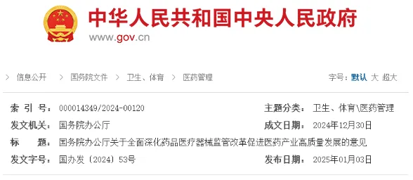 2025年1月3日,國務院辦公廳發布了《關于全面深化藥品醫療器械監管改革促進醫藥產業高質量發展的意見》(國辦發〔2024〕53號)。國家藥監局相關負責人表示,意見的出臺將深化藥品醫療器械監管全過程改革,加快構建全國統一大市場,打造全球競爭力的創新生態,助力我國從制藥大國向制藥強國跨越。