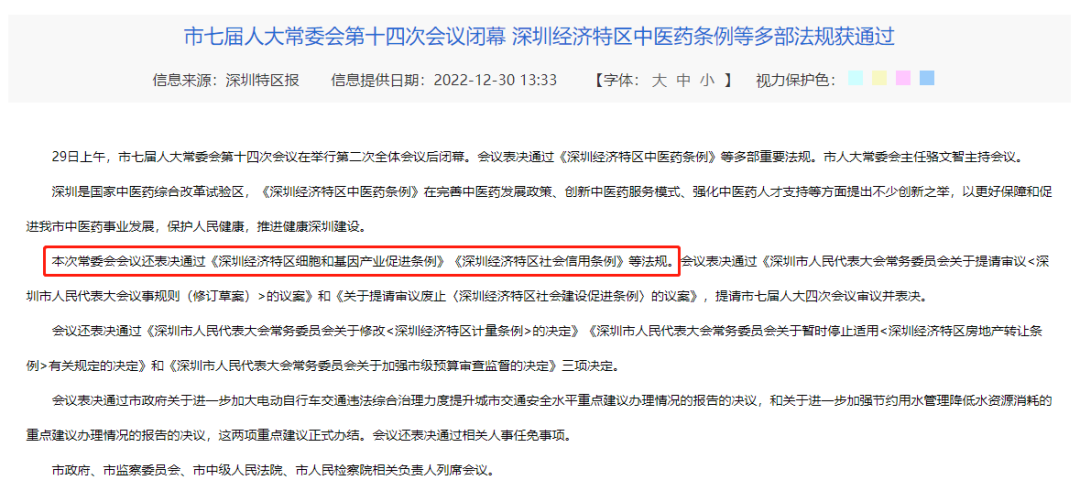 深圳市第七屆人大常委會第十四次會議正式表決通過《深圳經(jīng)濟(jì)特區(qū)細(xì)胞和基因產(chǎn)業(yè)促進(jìn)條例》