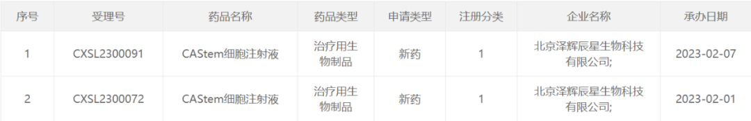 2023年2月7日,據CDE官網公示,北京澤輝辰星生物科技有限公司(以下簡稱“澤輝生物”)的人胚干細胞產品“CAStem細胞注射液”新適應癥臨床試驗申請獲得受理(受理號:CXSL2300091)。這是繼今年2月1日后申報的第二項新適應癥。